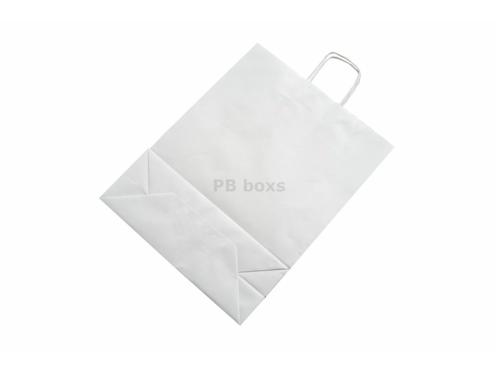 Bílá papírová taška s krouceným uchem je vyrobena z kraftového papíru, má boční sklady a vyztužené dno.