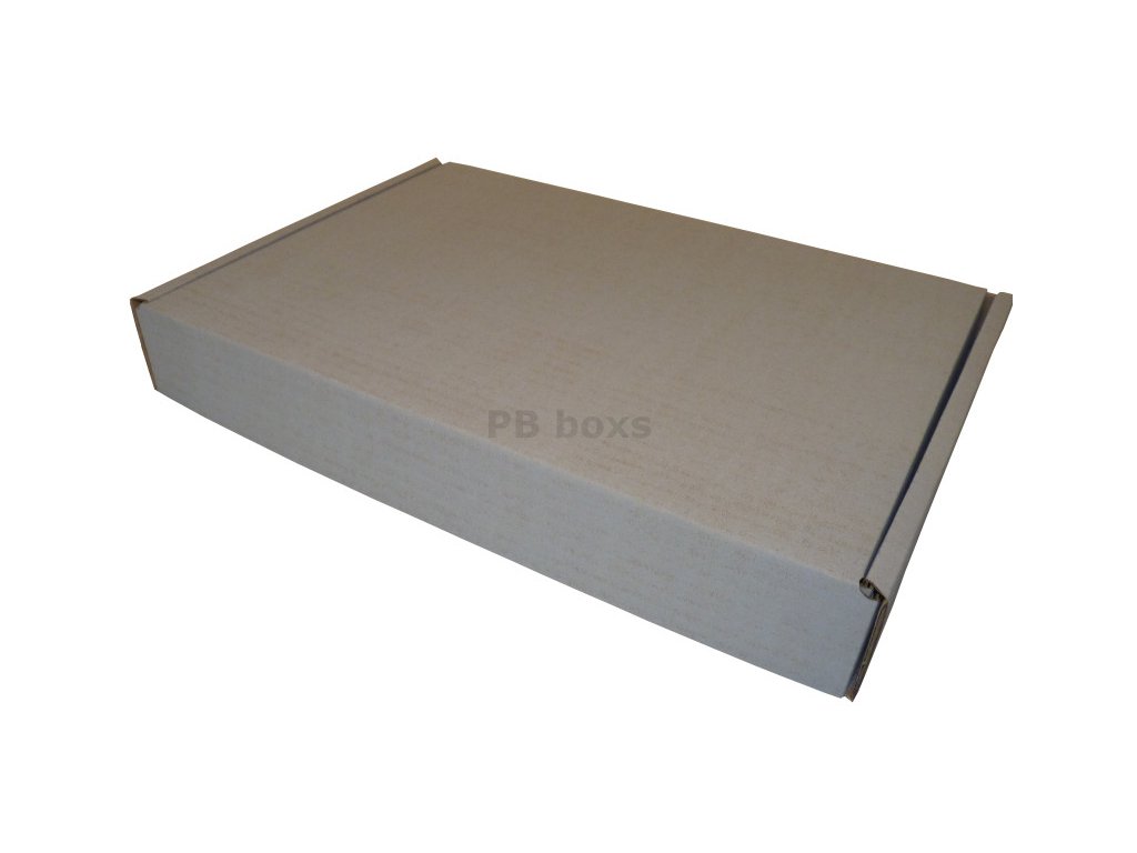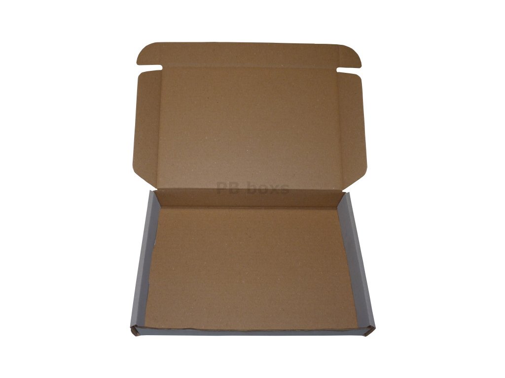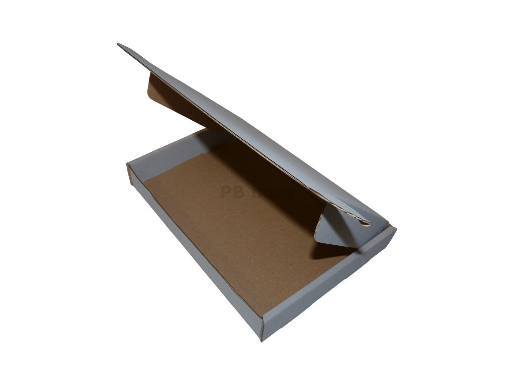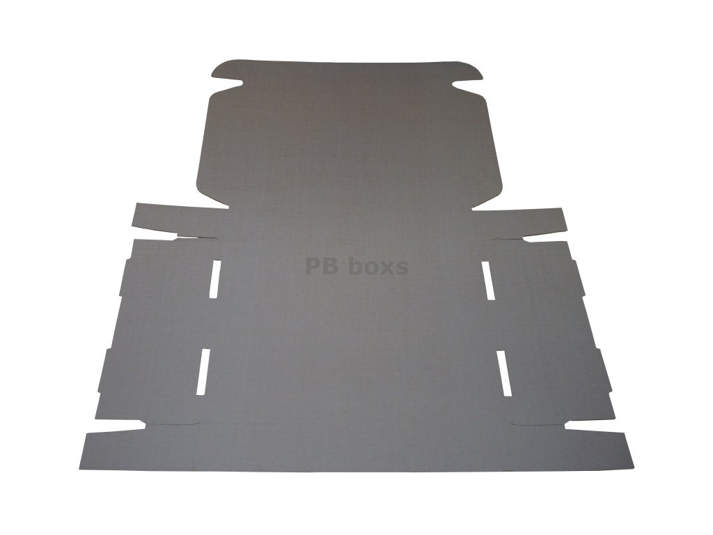 Šedá skládaná krabice o vnitřním rozměru 305x215x45 mm z třívrstvé lepenky. Snadné složení, rozměr A4, dodáno v plochém stavu.